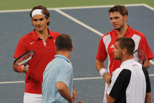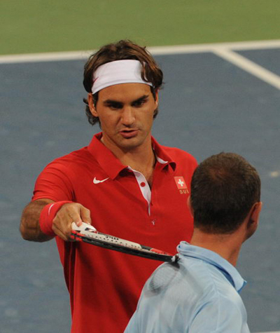 奧運(yùn)賽場(chǎng)花許多,在網(wǎng)球男雙第二輪比賽前,一只螞蚱飛到了裁判的后背上,“天王”費(fèi)德勒用球拍趕走了螞蚱。新華社記者邢廣利攝