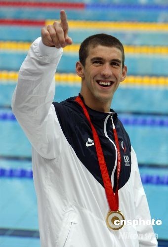 8月15日上午,在國(guó)家游泳中心水立方舉行的北京奧運(yùn)會(huì)男子200米混合泳中,美國(guó)選手菲爾普斯續(xù)寫(xiě)神話(huà),再次打破世界紀(jì)錄獲得冠軍,收取他在本屆奧運(yùn)的第六枚金牌,使得他在奧運(yùn)會(huì)上獲得的金牌總數(shù)達(dá)到12枚。中新社發(fā) 杜洋 攝