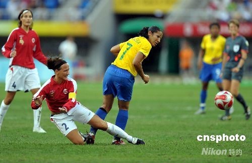 8月15日,奧運(yùn)女足四分之一決賽在天津奧體中心水滴體育場舉行,由挪威女足對陣巴西隊(duì),巴西上半時7號丹尼埃拉領(lǐng)先一球。中新社發(fā) 陳文 攝