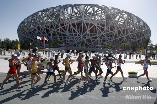 圖:男子20公里競(jìng)走在北京“鳥(niǎo)巢”舉行