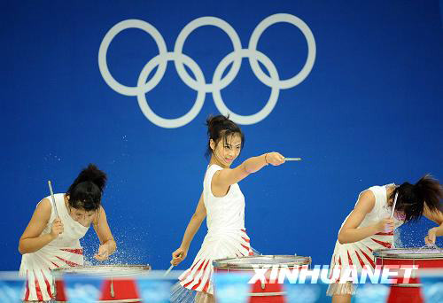 8月16日,演員們在游泳比賽開始前進行水鼓表演。