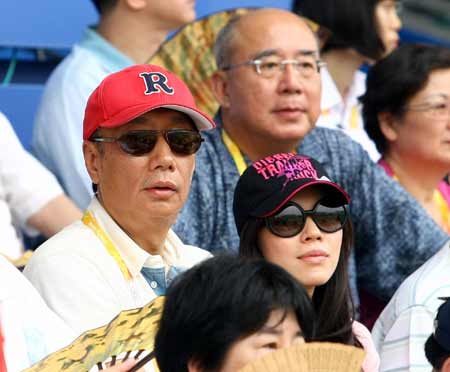 2008北京奧運會棒球賽13日在五棵松體育中心舉行中華臺北隊對荷蘭隊的揭幕戰(zhàn),鴻海集團(tuán)董事長郭臺銘(左)和妻子曾馨瑩也到場看球。(上圖)