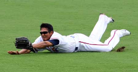 北京奧運棒球賽13日在五棵松體育中心舉行中華臺北隊對荷蘭隊之戰(zhàn),中華臺北隊選手林哲瑄一個漂亮的接殺,整個人撲倒在地上。(下圖)
