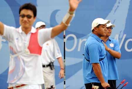 北京奧運女子個人射箭賽12日在北京奧林匹克公園射箭場舉行,中華臺北隊吳蕙如輸給對手未能晉級,心情相當(dāng)難過。(下圖)