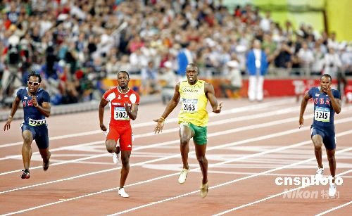 8月16日,牙買加選手尤塞恩·博爾特在國家體育場“鳥巢”進(jìn)行的北京奧運會男子100米決賽中以9秒69的成績奪得金牌并打破9秒72的世界紀(jì)錄。中新社發(fā) 盛佳鵬 攝