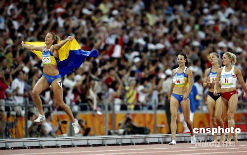 8月16日晚,經過兩天的激烈角逐,田徑女子七項全能比賽的最終結果在北京國家體育場產生,烏克蘭選手納塔利婭·多布林斯卡以總分6733分獲得冠軍,另一位烏克蘭選手柳德米拉·布隆斯卡以總分6700分獲得亞軍,美國選手海利亞絲·方丹以總分6619分名列第三。圖為納塔利婭·多布林斯卡慶祝奪冠。中新社發(fā) 盛佳鵬 攝