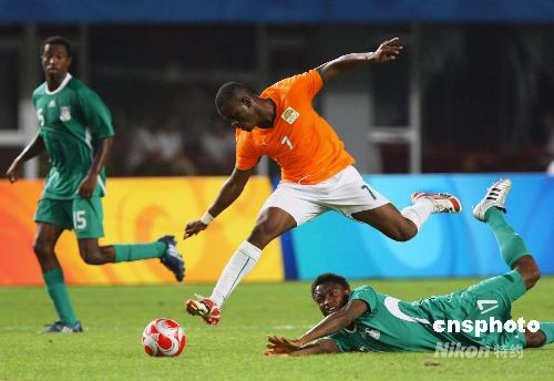 8月16日晚,北京奧運會男子足球1/4決賽,尼日利亞(綠)對陣科特迪瓦比賽在秦皇島奧體中心舉行,最終尼日利亞2:0勝科特迪瓦,挺進四強。中新社發(fā) 劉新 攝
