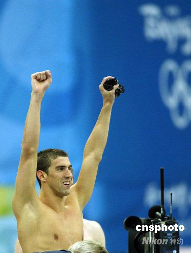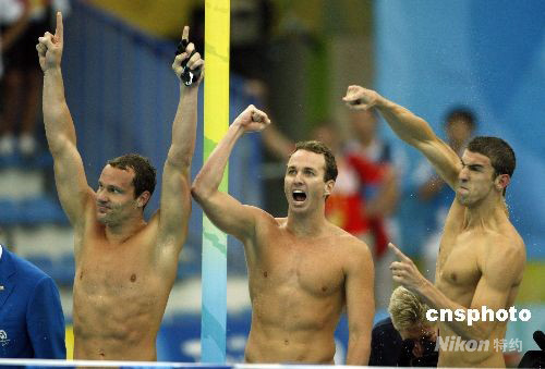 8月17日,美國隊獲得北京奧運會男子4乘100米混合泳接力冠軍,至此,23歲的美國游泳運動員菲爾普斯不僅用8金刷新了單屆奧運會金牌紀錄,而且還將個人所有奧運會的金牌總數(shù)提高到了14枚,達成了他人難以超越的“世界紀錄”。 中新社發(fā) 杜洋 攝
