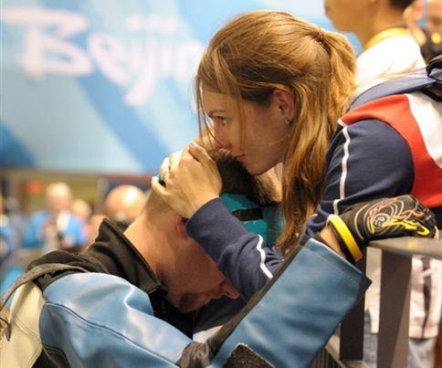 如果埃蒙斯打出“正常的”最后一槍,今夜將多么浪漫多么完美!八天前,美麗的卡特琳娜射落北京奧運(yùn)的第一金,埃蒙斯沖進(jìn)場(chǎng)內(nèi),擁著卡特琳娜深情熱吻。男人說,這是對(duì)自己雅典失敗的補(bǔ)償。女人說,是愛的力量幫她一路闖關(guān)。世界為之動(dòng)容。