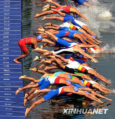 8月19日,中國香港選手李致和在出發(fā)入水時(shí)比其他選手慢了半拍。 當(dāng)日,北京奧運(yùn)會(huì)鐵人三項(xiàng)男子組決賽在北京十三陵水庫舉行。新華社記者王毓國攝