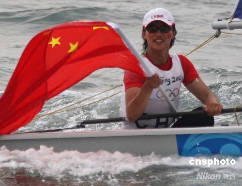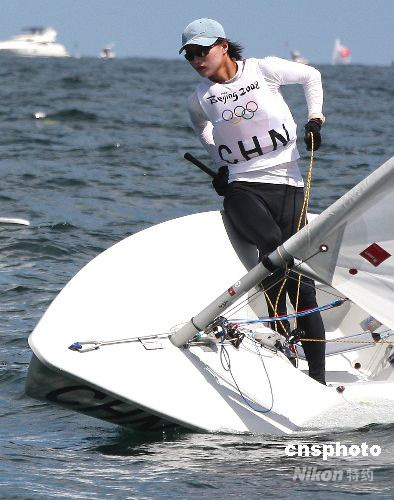 北京2008奧運(yùn)帆船比賽8月19日在青島繼續(xù)舉行,女子激光雷迪爾級進(jìn)行獎牌輪(決賽)爭奪,中國選手徐莉佳獲得銅牌。 中新社發(fā) 趙振清 攝