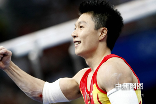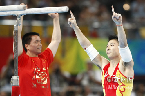 8月19日,中國選手李小鵬以總分16.450奪得北京奧運(yùn)會(huì)體操男子雙杠金牌。中新社發(fā) 盛佳鵬 攝