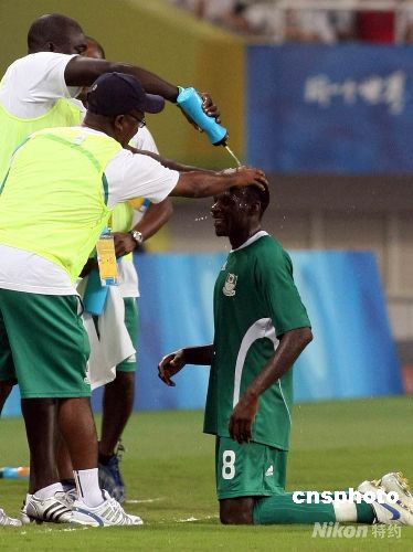 8月19日,北京奧運會男足半決賽,尼日利亞以4:1大勝比利時,晉級奧運男足決賽。圖為尼日利亞球員用“洗頭”的方式來慶祝勝利。中新社發(fā) 湯彥俊 攝