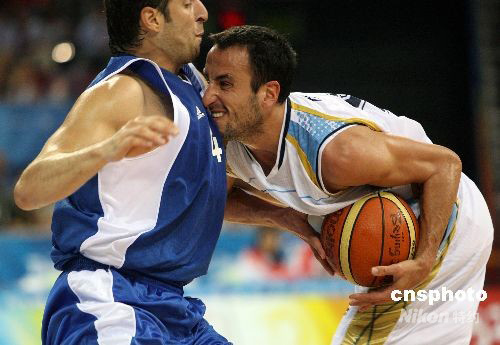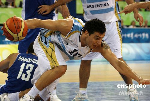 北京奧運(yùn)會男籃最后一場八進(jìn)四比賽,8月20日午夜時(shí)分在五棵松籃球館舉行,南美洲冠軍、雅典奧運(yùn)會冠軍阿根廷隊(duì)以80比78驚險(xiǎn)戰(zhàn)勝歐洲勁旅希臘隊(duì),進(jìn)入前四名。阿根廷隊(duì)將與美國“夢八隊(duì)”爭奪決賽權(quán)。隊(duì)中“老大”、在NBA馬刺隊(duì)效力的球星吉諾比利不僅砍下全場最高的24分,而且在最后時(shí)刻投中關(guān)鍵一球;另一名球星10號德爾菲諾(DELFINO Carios Francisco)砍下23分。中新社發(fā) 任晨鳴 攝