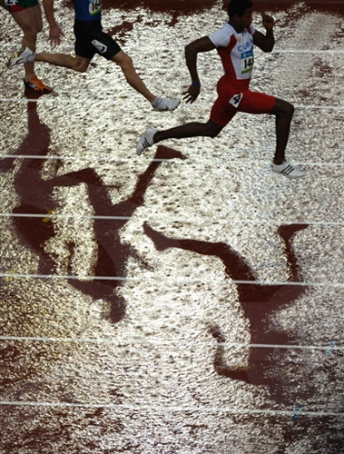 8月21號(hào)上午,在國家體育場(chǎng)“鳥巢”進(jìn)行的北京奧運(yùn)會(huì)田徑比賽迎來大雨,運(yùn)動(dòng)員們?cè)谟曛懈?jìng)技。