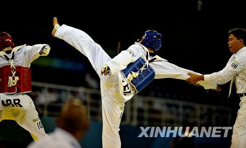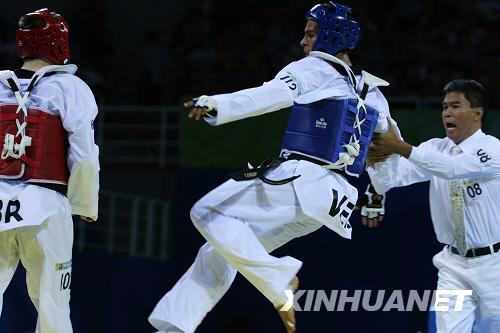 8月22日,在北京奧運(yùn)會(huì)跆拳道男子80公斤級(jí)四分之一決賽中,裁判拉住委內(nèi)瑞拉選手巴斯克斯·卡瓦哈(中),要求這位選手停止進(jìn)攻。在這場比賽中,巴斯克斯·卡瓦哈負(fù)于對(duì)手英國選手庫克。新華社記者邢廣利攝