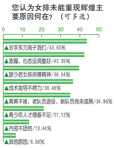 本次調(diào)查發(fā)現(xiàn),女排敗給對(duì)手,43.6%的人認(rèn)為是對(duì)手實(shí)力高于我們,42.4%的人認(rèn)為緣于我們自己急躁,沒(méi)有調(diào)整好心態(tài)。39.5%的人認(rèn)為,目前的女排缺少當(dāng)年老女排的拼搏精神。