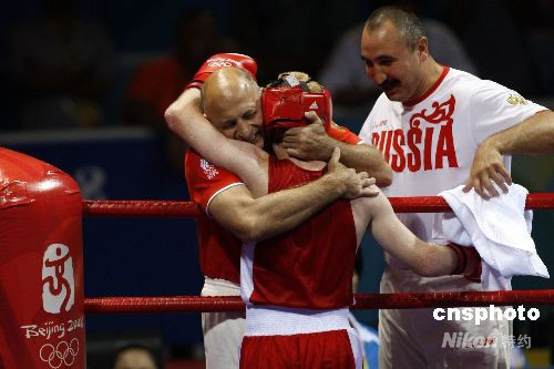 8月24日,在北京奧運會拳擊比賽男子輕量級(60公斤級)決賽中,俄羅斯選手阿列克謝·季先科(紅)戰(zhàn)勝法國選手達烏達·索夫贏得冠軍。 中新社發(fā) 盛佳鵬 攝