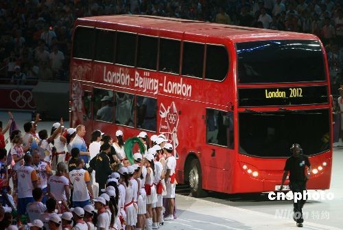 8月24日晚,北京奧運(yùn)會閉幕式在奧林匹克公園內(nèi)的國家體育場舉行,下屆奧運(yùn)會主辦城市倫敦市上演“倫敦8分鐘”演出,一輛倫敦標(biāo)志性的雙層紅色巴士駛?cè)搿傍B巢”體育場。中新社發(fā) 任晨鳴 攝