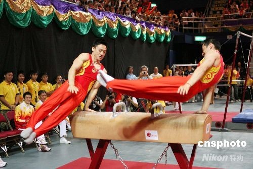 金牌選手楊威、肖欽作鞍馬精彩表演,博得全場(chǎng)熱烈的掌聲。中新社發(fā) 洪少葵 攝