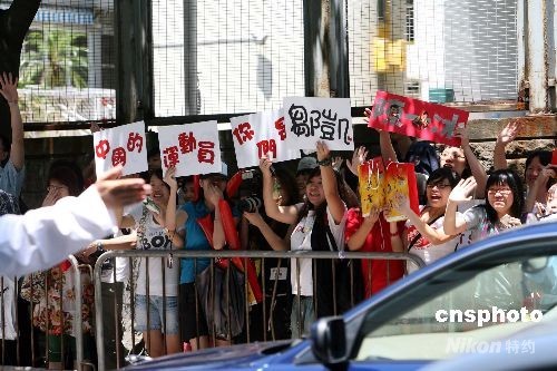 北京奧運會內(nèi)地金牌運動員代表團(tuán)在香港伊麗莎白體育館作示范表演,大批 “粉絲”在場外苦候,希望一睹金牌選手風(fēng)采。中新社發(fā) 洪少葵 攝