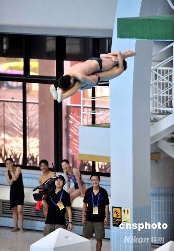 跳水運動員在荃灣城門谷游泳池作跳水示范表演。香港特區(qū)行政長官曾蔭權同太太亦到場觀賞跳水表演。中新社發(fā) 譚達明 攝