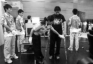 一名殘疾人雙手拄拐,站到“入口”處,一名安檢員接過他的拐杖,扶住他的身體,徒手檢查其身體各部位。昨日(8月31日)下午,數(shù)百名殘奧會場館安檢員在北京市殘聯(lián)接受“特訓”,以適應殘奧會期間的安檢需求。