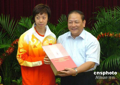 中央駐澳聯(lián)絡(luò)辦九月一日宴請訪問澳門的奧運金牌運動員代表團。圖為中聯(lián)辦主任白志健向運動員代表張怡寧贈送紀念品。中新社發(fā) 畢永光 攝