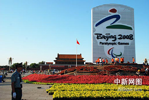 9月1日,殘奧會會徽“天地人”造型亮相天安門廣場。為了迎接第13屆殘奧會的到來,天安門廣場的奧運花壇在今天上午成功轉(zhuǎn)換為殘奧會花壇。中心花壇的中國印被殘奧會的會徽所替代。35萬盆補(bǔ)充鮮花亮相天安門廣場。記者:楊慧峰 攝