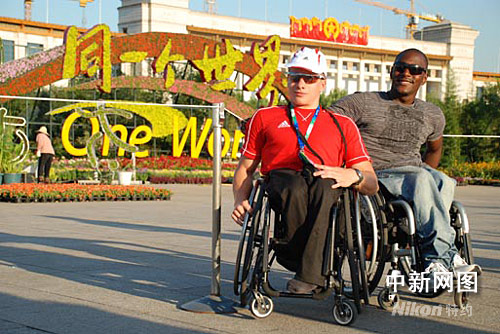 9月1日,兩名外國殘疾人運動員在北京天安門合影。隨著北京殘奧會的臨近,北京市區(qū)到處洋溢著歡快祥和的氛圍,世界各地參加比賽的殘疾人運動員也都紛紛相約北京。作者:楊慧峰 攝