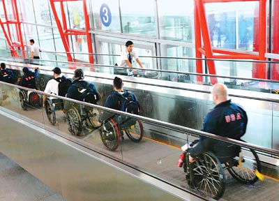 9月1日下午,來自美國的殘奧大家庭成員,坐著輪椅順利通過首都機場內的無障礙入境專用通道。