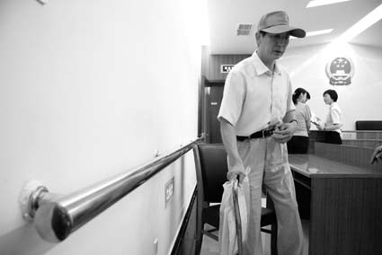 圖為奧運(yùn)村無(wú)障礙法庭內(nèi)安裝了便于殘障人員扶持的金屬桿。庭審結(jié)束,祁寶麟起身準(zhǔn)備離開法庭 李松 黃潔 徐偉倫攝