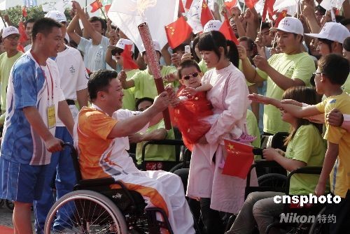 9月4日, 火炬手在最具洛陽特色的城市名片——世界文化遺產(chǎn)龍門石窟景區(qū)內(nèi)傳遞殘奧會火炬。當(dāng)日,北京2008殘奧會火炬在千年帝都、牡丹花城洛陽傳遞,這是火炬進(jìn)京前最后一站,共有65名火炬手參加。中新社發(fā) 張曉理 攝