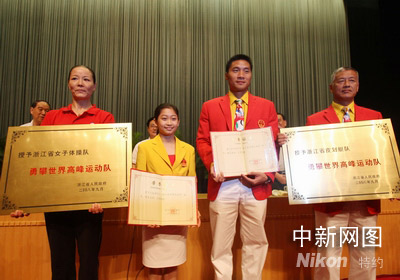 浙江軍團(tuán)取得如此優(yōu)秀的成績,浙江省委、省政府決定獎勵奧運(yùn)冠軍江鈺源、孟關(guān)良人民幣六十萬元,并分別授予浙江省功勛運(yùn)動員稱號;獎勵銀牌選手朱啟南、楊雨、湯景之、蔡彤彤人民幣三十五萬元,并授予一等功運(yùn)動員稱號;獎勵銅牌獲得者周蘇紅人民幣二十萬元,并授予二等功運(yùn)動員。浙江女子體操隊、浙江皮劃艇隊獲得省“勇攀世界高峰運(yùn)動隊”稱號。