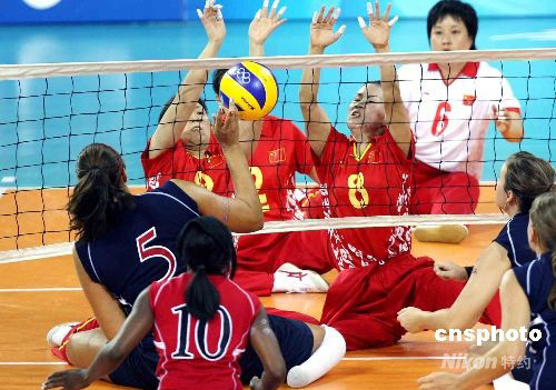 北京殘奧會坐式排球9月9日晚繼續(xù)在北京的中國農(nóng)業(yè)大學(xué)體育館舉行,雅典殘奧會冠軍中國女隊(duì)以3比0完勝美國隊(duì)。中新社發(fā) 任晨鳴 攝