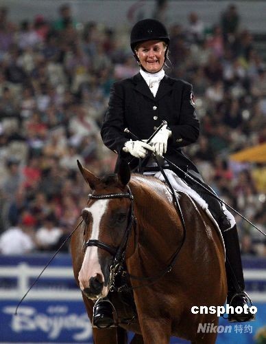 九月十日晚,來自加拿大選手勞倫·巴威克在香港殘奧馬術(shù)個人自選動作科目-級別II上奪得金牌。中新社發(fā) 洪少葵 攝