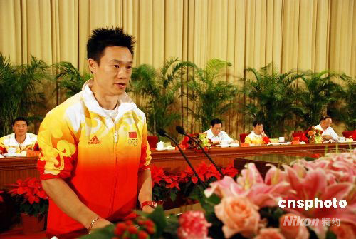 圖:體操個(gè)人全能冠軍楊威在報(bào)告會(huì)上發(fā)言