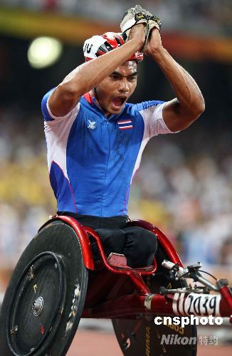 9月11日晚,北京殘奧會(huì)田徑比賽繼續(xù)在奧林匹克公園內(nèi)的國家體育場(chǎng)“鳥巢”舉行,在男子5000米-T54級(jí)決賽中,泰國選手巴越·沃霍倫一路領(lǐng)先,并在最后時(shí)刻頂住各路選手的反撲,在這個(gè)一直被歐美強(qiáng)手統(tǒng)治的項(xiàng)目中奪得冠軍。中新社發(fā) 任晨鳴 攝