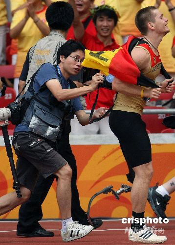 北京殘奧會田徑比賽9月16日繼續(xù)在北京奧林匹克公園內(nèi)的國家體育場--鳥巢舉行,F(xiàn)42級別的德國選手沃伊特克·奇日在男子跳遠(yuǎn)-F42/44級別決賽中以6.50米、1101分的成績打破世界紀(jì)錄獲得冠軍。賽后,沃伊特克·奇日身披國旗繞場飛奔與攝影記者“賽跑”。中新社發(fā) 任晨鳴 攝