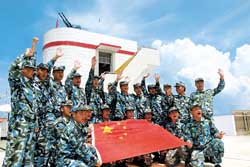 赤瓜礁附近海面,游弋著我海軍執(zhí)行戰(zhàn)斗值班任務(wù)的導(dǎo)彈護(hù)衛(wèi)艦。在遙遠(yuǎn)的南?吹阶约旱膽(zhàn)艦,大家都很激動。老實說,中華民族的和平發(fā)展是任何人也不能阻擋的。作為祖先留給我們的一筆大遺產(chǎn),南沙理應(yīng)成為我們由陸地向海洋、由淺藍(lán)向深藍(lán)進(jìn)行戰(zhàn)略發(fā)展的一個大空間。隨著人們對海洋的認(rèn)識不斷深化,隨著人類對海洋資源開發(fā)利用的能力不斷提高,南沙的戰(zhàn)略價值正日益凸顯。每次與南沙衛(wèi)士座談,他們都呼吁,強(qiáng)化海洋意識、海權(quán)意識、海軍意識,正當(dāng)其時。