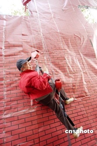 圖:六旬老漢演示高空快速降落救生機(jī)