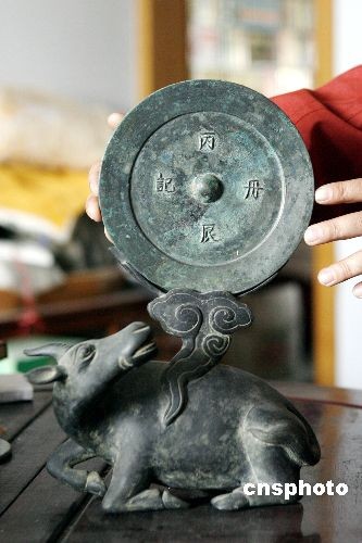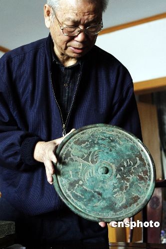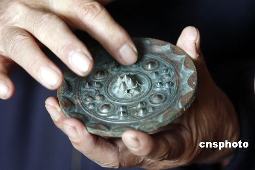 圖:收藏者展示罕見的明代銅質(zhì)鏡架