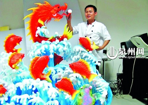 “飛天迎賓”、“鯉魚化龍”“東方醒獅”、“渡海觀音”等我(泉州)市各縣(市、區(qū))一些群眾熟悉的城市標(biāo)志,它們多為石頭、瓷、銅器等硬物雕刻而成。然而,在石獅某酒店中,“80后”的食雕師朱愛明,則用各種食品或泡沫雕成這些標(biāo)志,成為宴席上的亮點。