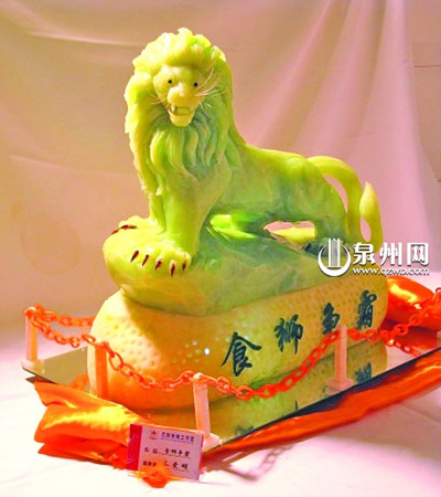 據(jù)朱愛明介紹,在作出雕刻城市標(biāo)志決定后,他便找機會對每個市標(biāo)進行實地觀察并拍照,然后取材!耙驗樵煨、圖案等的不同,不同的市標(biāo)必須用不同的食品來表現(xiàn)”,他說,比如石獅的市標(biāo),獅子頭尾高低位置相差較大,這就要求材質(zhì)必須是實心的,而且要雕出70cm高的作品,顯然很難從天然的瓜果蔬菜中找到,于是,他就選擇了石花膏。