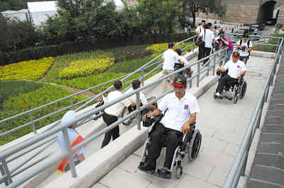 北京殘奧會(huì)的舉辦,對(duì)無(wú)障礙設(shè)施建設(shè)提出了更高的要求。景區(qū)為幫助殘疾人實(shí)現(xiàn)自主“登長(zhǎng)城、做好漢”的愿望,新建了2部無(wú)障礙升降平臺(tái)、180米無(wú)障礙登城坡道,并對(duì)盲道、廁所進(jìn)行了改造,使殘疾游客從下車到登上長(zhǎng)城都可以暢行無(wú)阻。目前,八達(dá)嶺無(wú)障礙設(shè)施已基本涵蓋景區(qū)所有旅游服務(wù)場(chǎng)所。