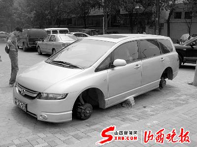 今天(17日),太原市和平北路與漪汾街附近,一輛停在路邊的本田商務(wù)車引來(lái)眾多市民圍觀。這輛車的4個(gè)輪子全被卸掉,無(wú)法行駛。