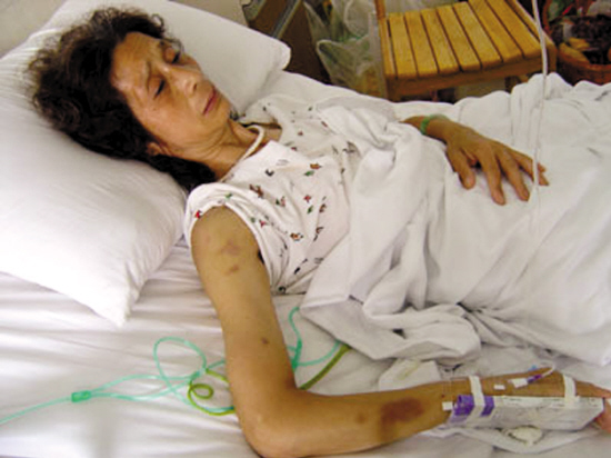 據(jù)該帖描述,陳玉蓮頭上、身上、胳膊上、腿上遍布傷痕。診斷結果是,她被打成腦震蕩,軟組織挫傷幾十處,左腳功能障礙,植物神經紊亂……她躺在病床上,渾身哆嗦,嘔吐腹瀉不止,發(fā)燒幾天,身心受到了重創(chuàng)。陳玉蓮的妹妹陳翠蓮昨晚接受羊城晚報記者采訪時說,陳玉蓮剛打過針,因腦震蕩影響,正在病床上昏睡,而她左腳至今無法踏地。