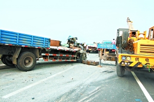 上午8時(shí),記者趕到現(xiàn)場(chǎng)時(shí),飲鹿池橋雙向仍有些擁堵。貨車事故發(fā)生在東向西最內(nèi)側(cè)車道上,一輛吊車正在把從事故車上分離出來(lái)的零件吊到其他貨車上運(yùn)走,外側(cè)只有一條車道可供通行。而西向東的撞人現(xiàn)場(chǎng)已基本清理完畢,交通逐漸恢復(fù)。