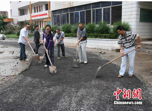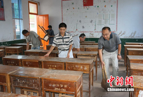在工地上,記者見到了正在監(jiān)督工程質(zhì)量的官盛鎮(zhèn)小學(xué)校長袁道川,過于疲倦的雙眼深陷,但仍顯得精悍而干練。“從7月18日起,我們的教職員工和班子成員都在堅(jiān)守崗位,由于今年的水位高、淤泥多,校園恢復(fù)重建難度相當(dāng)大。為了對(duì)全鄉(xiāng)的中小學(xué)生負(fù)責(zé),必須加班加點(diǎn)地重建。300套學(xué)生桌凳全部到位,8月30日,學(xué)生順利入學(xué)沒有問題!