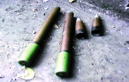 正在這時(shí),劇組那名工作人員發(fā)現(xiàn)了異樣。在一個(gè)堆著啤酒瓶、廢紙的地方,有4根鐵的條狀物很是怪異:長(zhǎng)的2根有1尺多長(zhǎng),一頭是綠色的,一頭是棕色的;另外2根很短,是圓錐體,尖上是白色的,身體是棕色的,尾部又是黑色的!鞍⊙,這里有火箭彈!”這員工一聲喊,把周?chē)娜藝樍艘淮筇?/p>